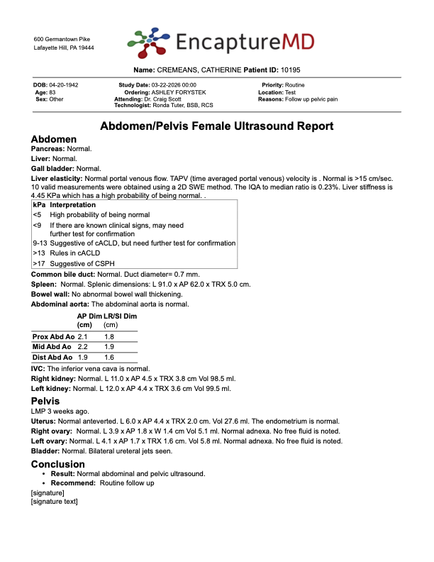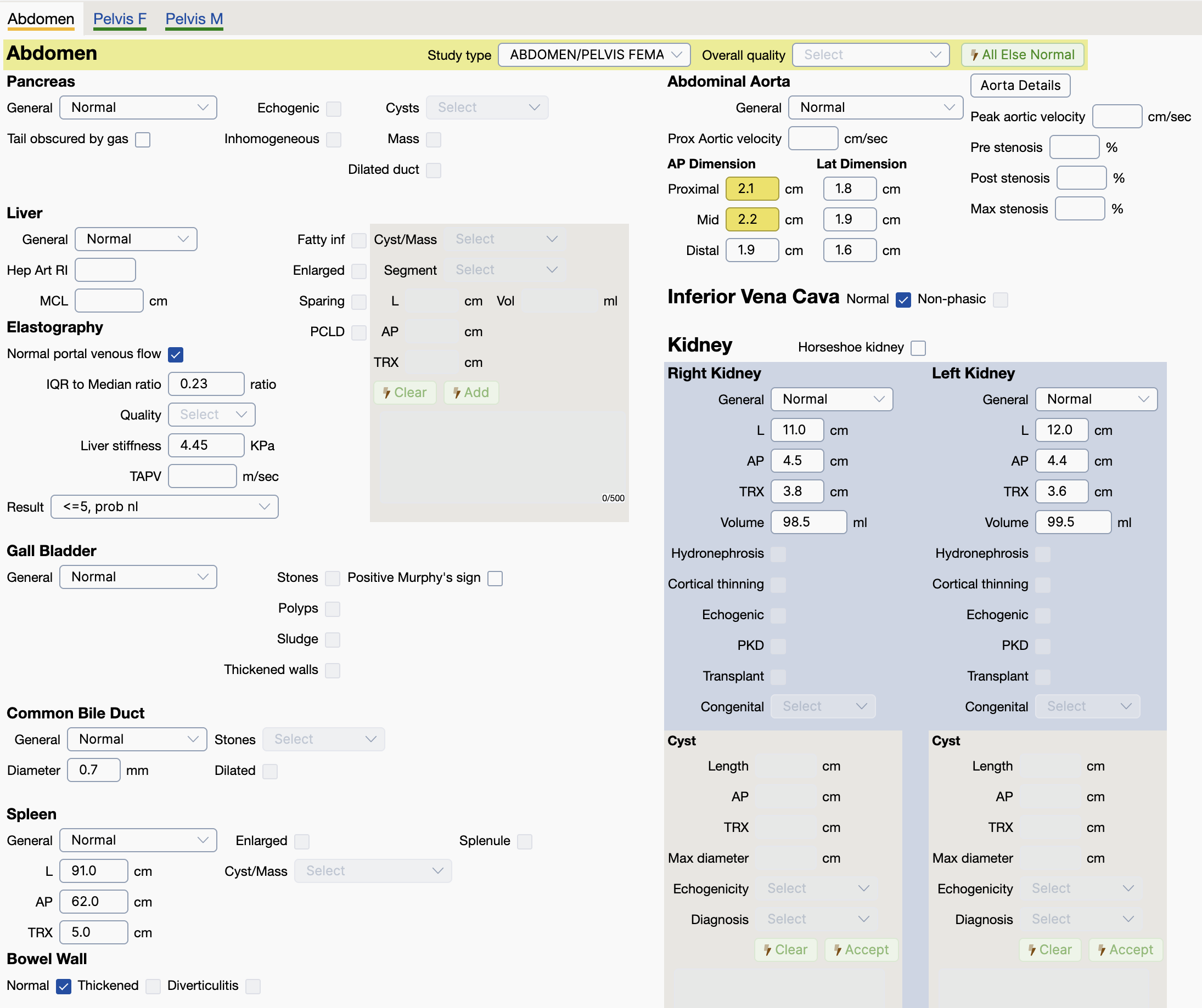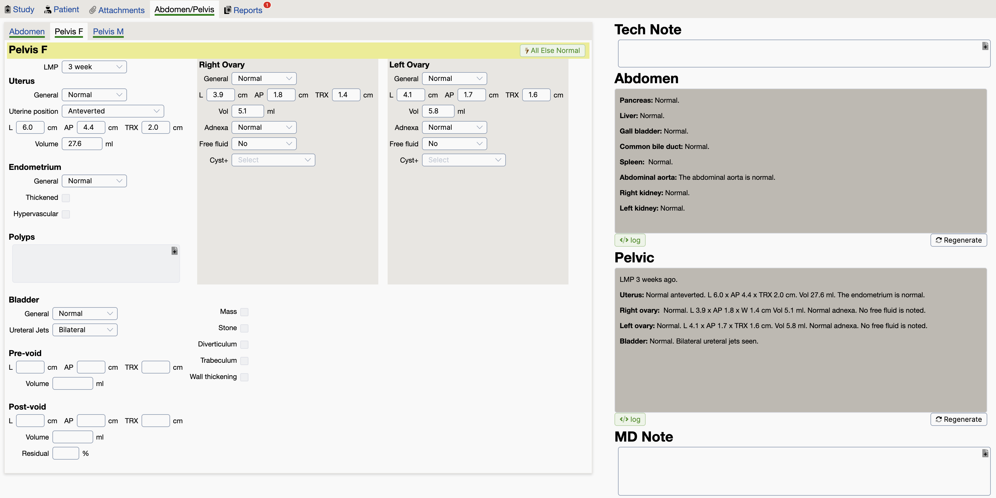 The EncaptureMD Abdominopelvic app allows the sonographer to generate a near-complete report using a point-and-click interface in combination with user-defined templates. Measurements flow from the ultrasound machine and help construct the report. The radiologist can use this as data to dictate or can finalize the report in EncaptureMD.