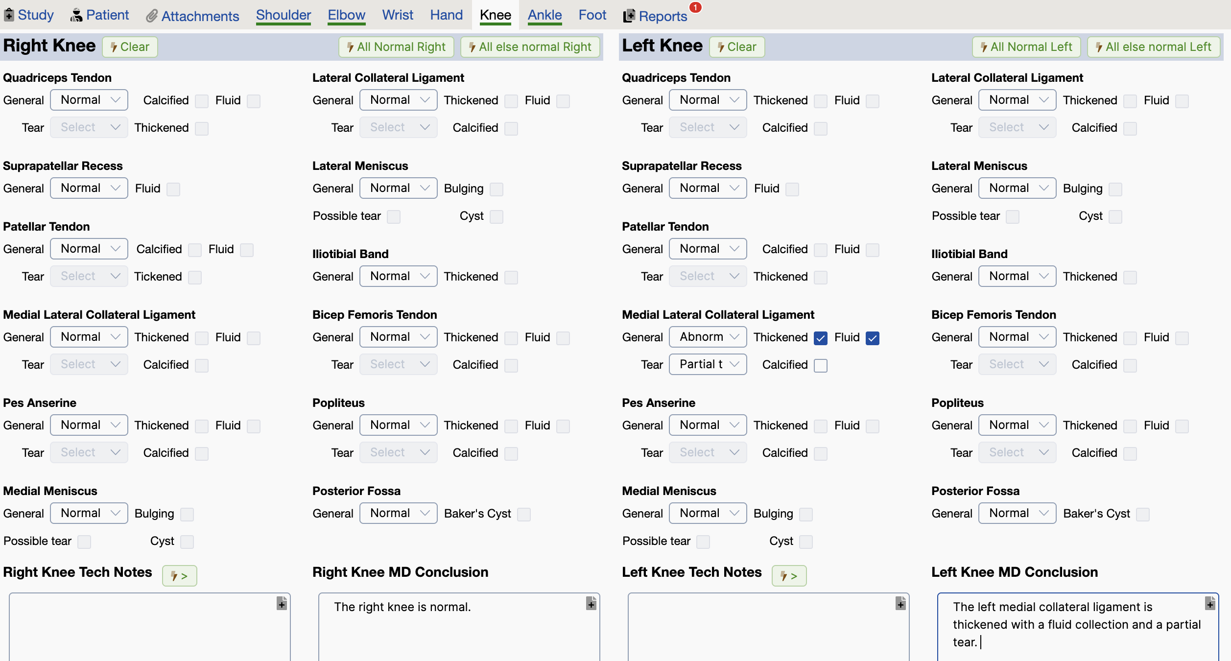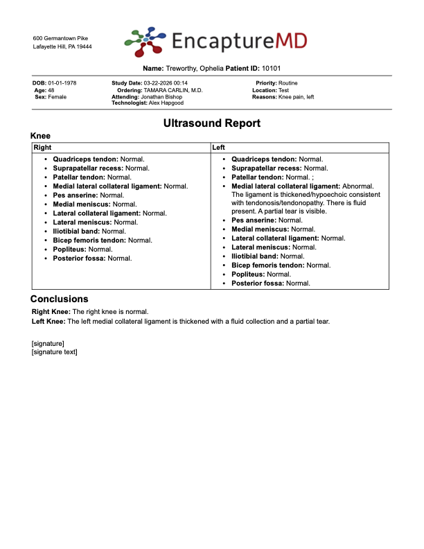 This app focuses on procedure reports for muscles, tendons, ligaments, and joints. The sonographer can quickly create reports to be used for radiologist dictation or the report can be signed within EncaptureMD. It uses a combination of point and click reporting with templates to easily construct a report.