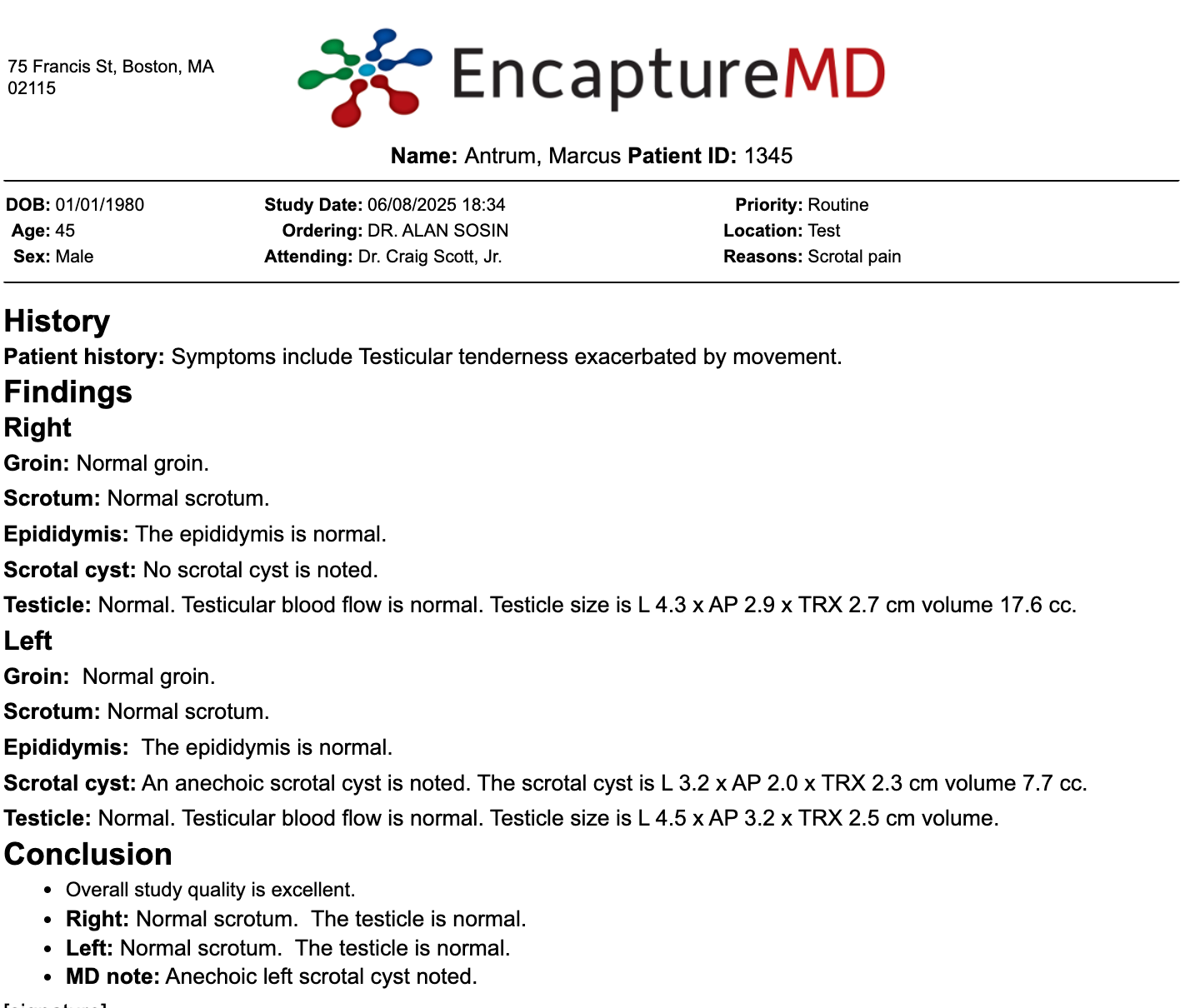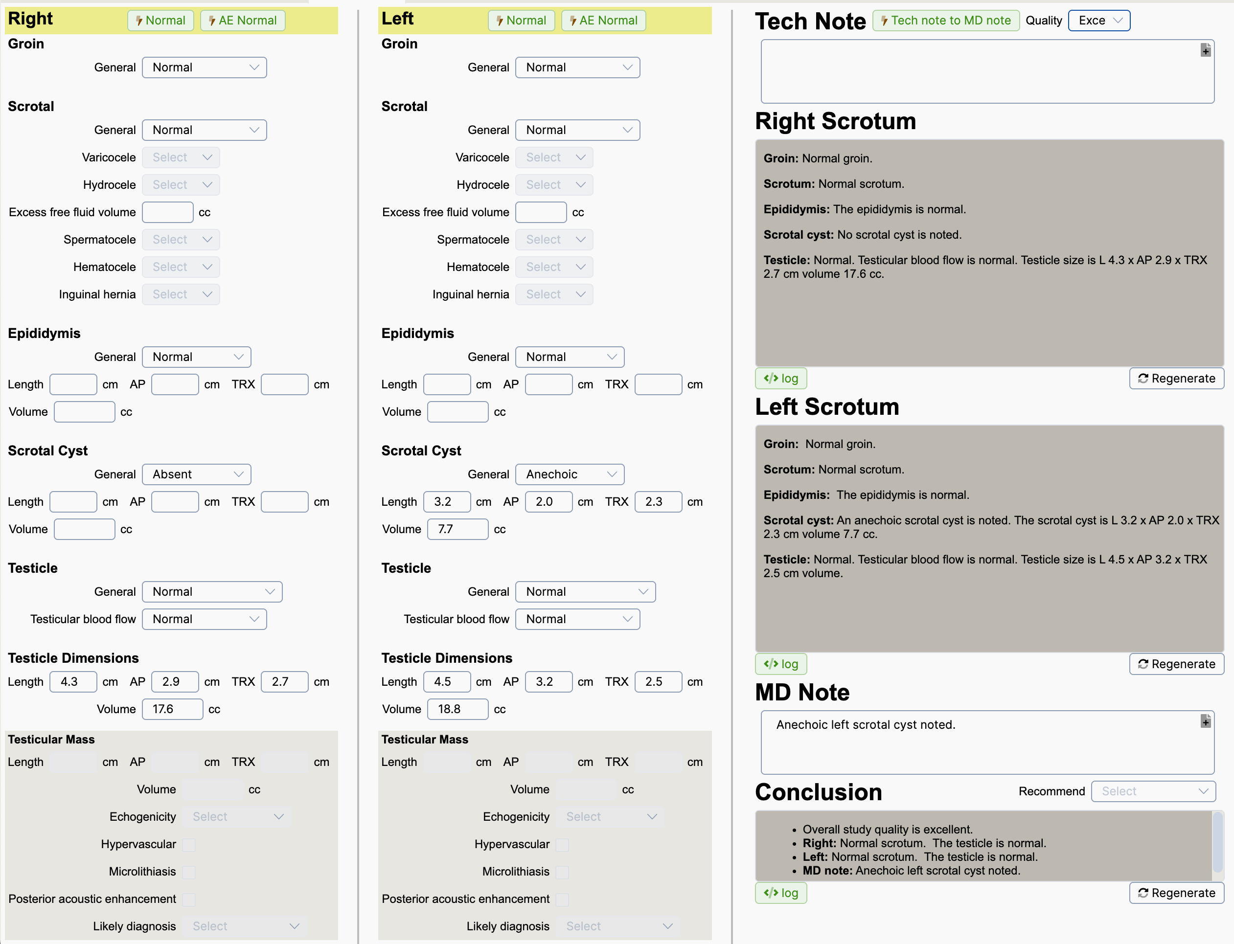 The Scrotal ultrasound application creates reports for diagnosis of male reproductive organ findings. Measurements flow from the modality to allow reporting of both quantitative and qualitative findings.