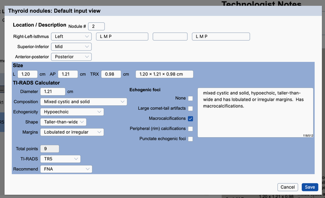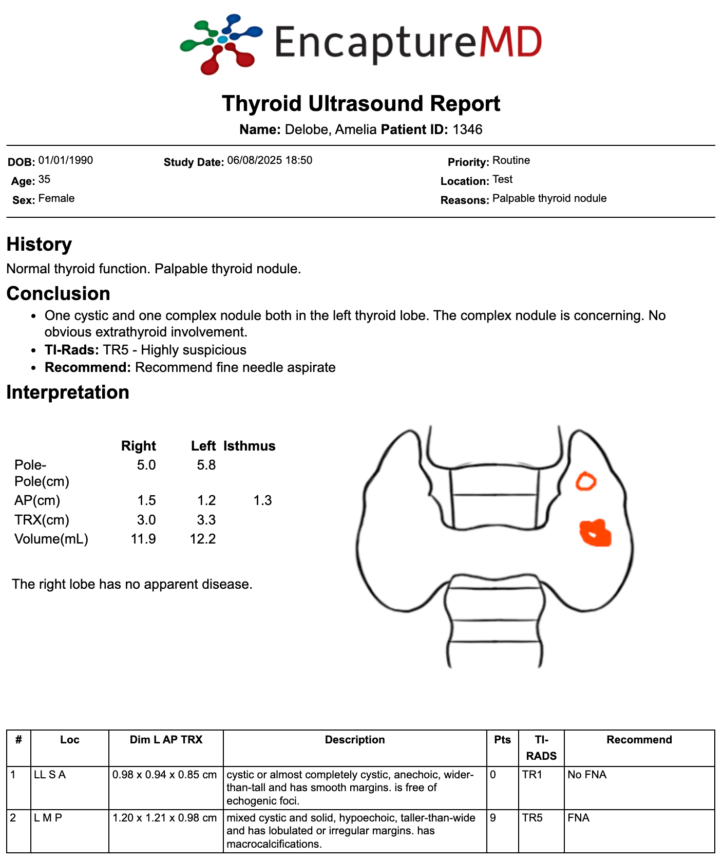 Our Thyroid ultrasound application describes the overall dimensions and descriptors of the thyroid, a table of nodules with dimensions imported from the modality with additional descriptors which calculates the TI-RADS score. A thyroid diagram can easily communicate nodule location to the ordering physician and the report clearly outlines next steps.